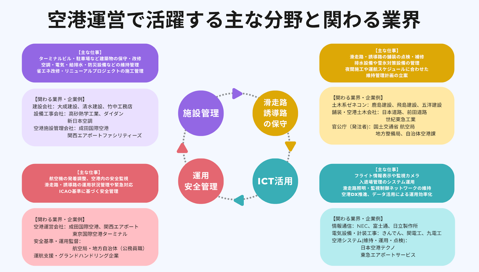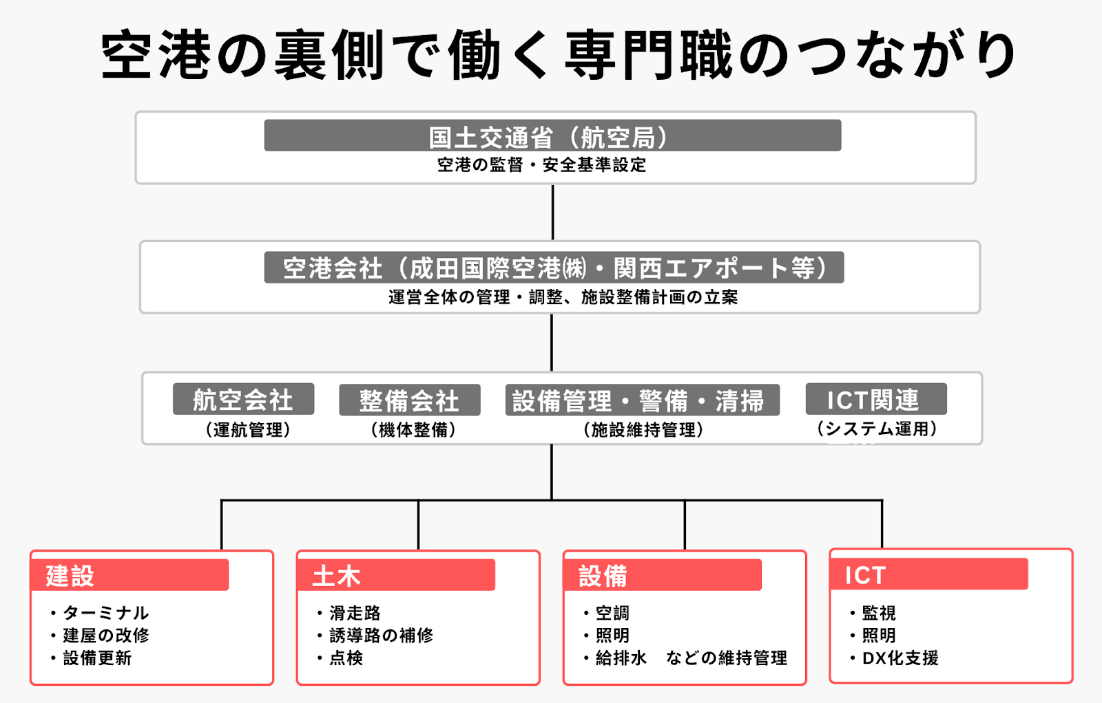空港の運営は、国土交通省や空港会社(例:成田国際空港株式会社、関西エアポートなど)を中心に、航空会社・整備会社・設備管理会社・警備・清掃事業者・ICT関連企業など、多くの組織が連携して行われています。