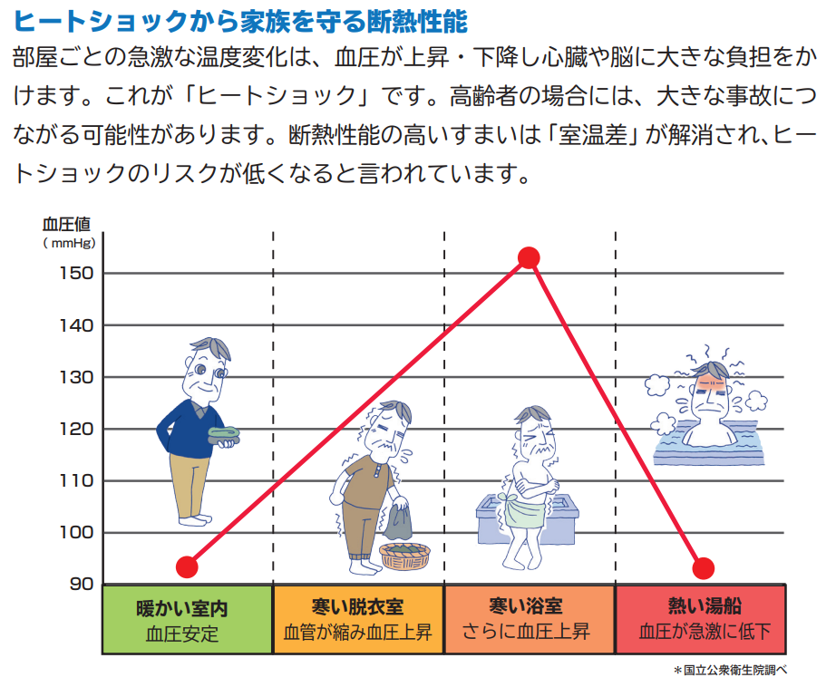 特に問題となるのが、居室間の温度差による血圧の急激な変動です。暖かい部屋から寒い脱衣所・浴室などに移動した際に生じる「ヒートショック」は、高齢者を中心に多くの健康被害・死亡事故を引き起こしています。
