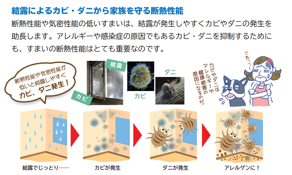 つまり、住宅の断熱をしっかり行うことで、結露を防ぎ、カビやダニの発生も抑えられます。その結果、家を長持ちさせるだけでなく、家族の健康も守ることにも繋がるのです。