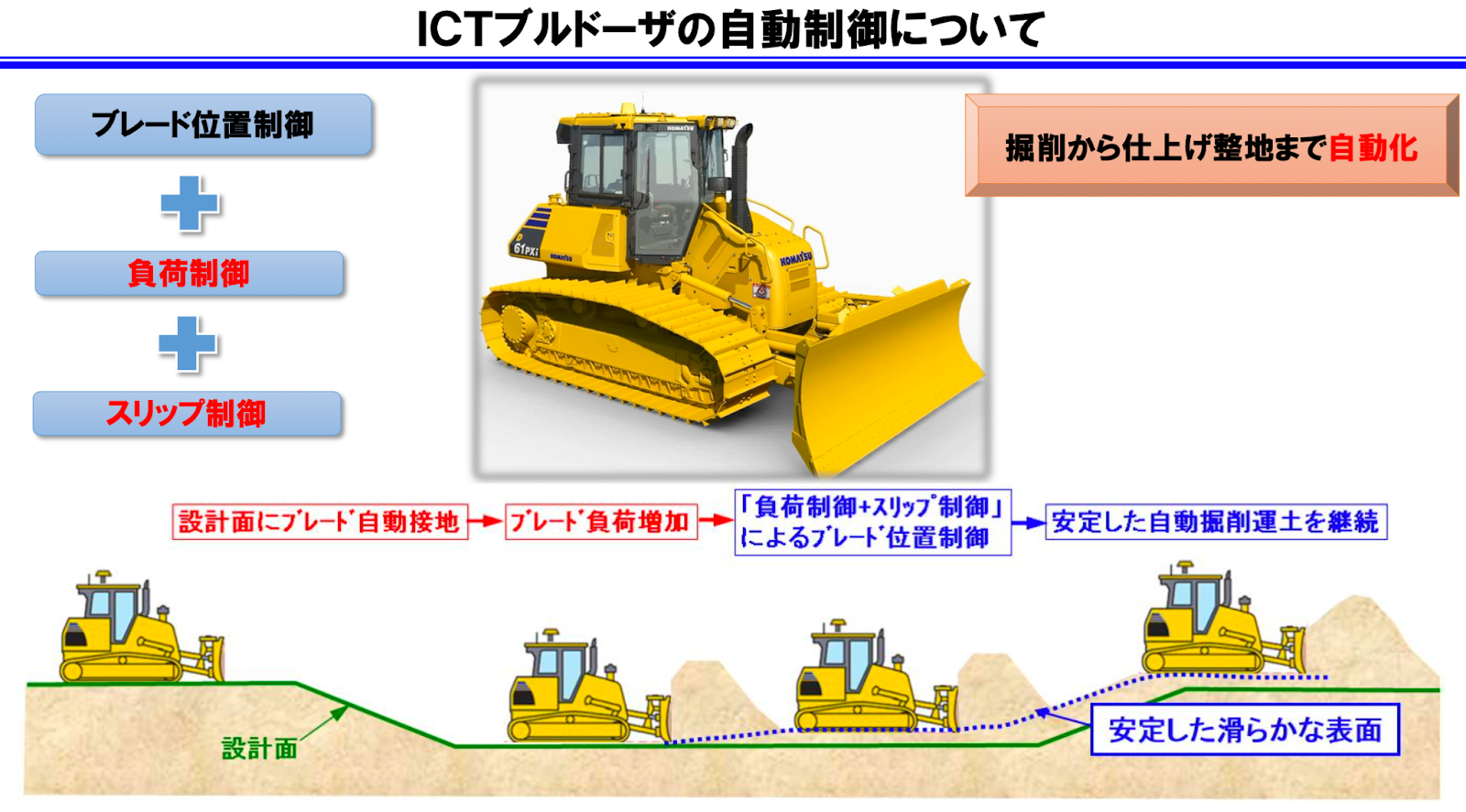 現場での土工や舗装といった「施工作業」そのものを自動化する取り組みです。