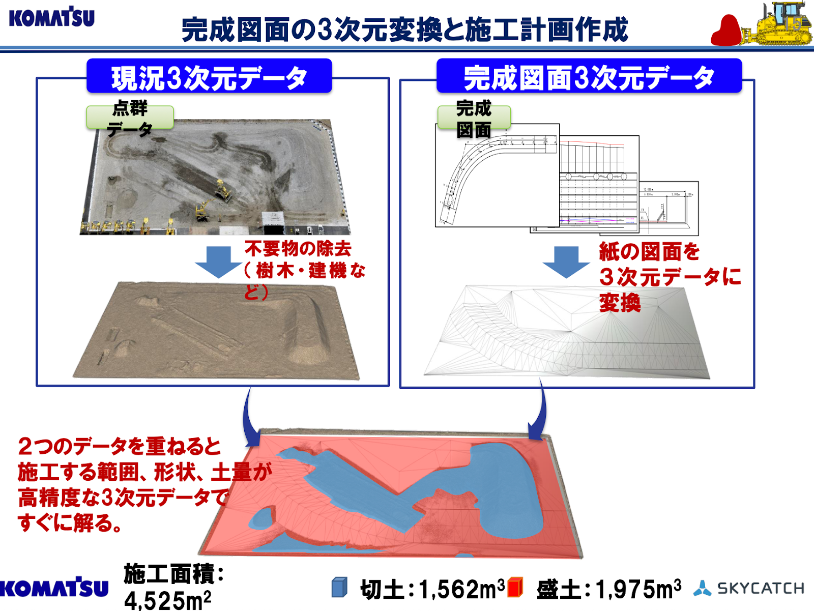 たとえば、ドローンで測量した地形データをクラウドにアップすると、すぐに3Dの設計図に反映され、重機の動きにも反映されるようになります。